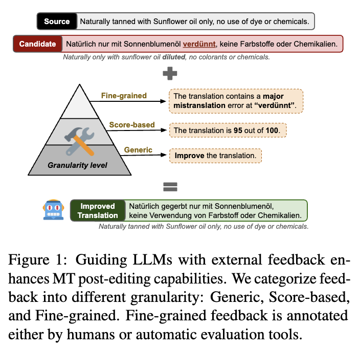 外部反饋的應(yīng)用:不依賴模型自我生成的反饋,研究者使用外部反饋來指導(dǎo)LLM改進(jìn)翻譯。