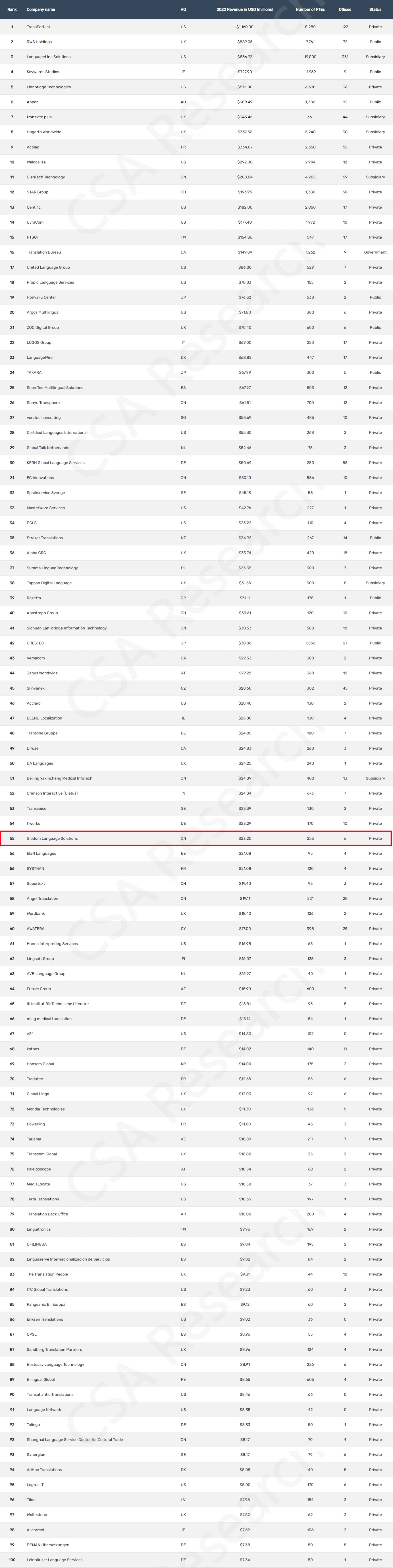 近日,國際知名的語言咨詢研究公司CSA Research發(fā)布《The Top 100 Language Service Providers: 2023》(2023年全球百強語言服務(wù)商)榜單。新宇智慧被評為全球百強語言服務(wù)提供商之一,排名第55位,并獲得連續(xù)10年全球百強語言服務(wù)商榮譽徽章。
