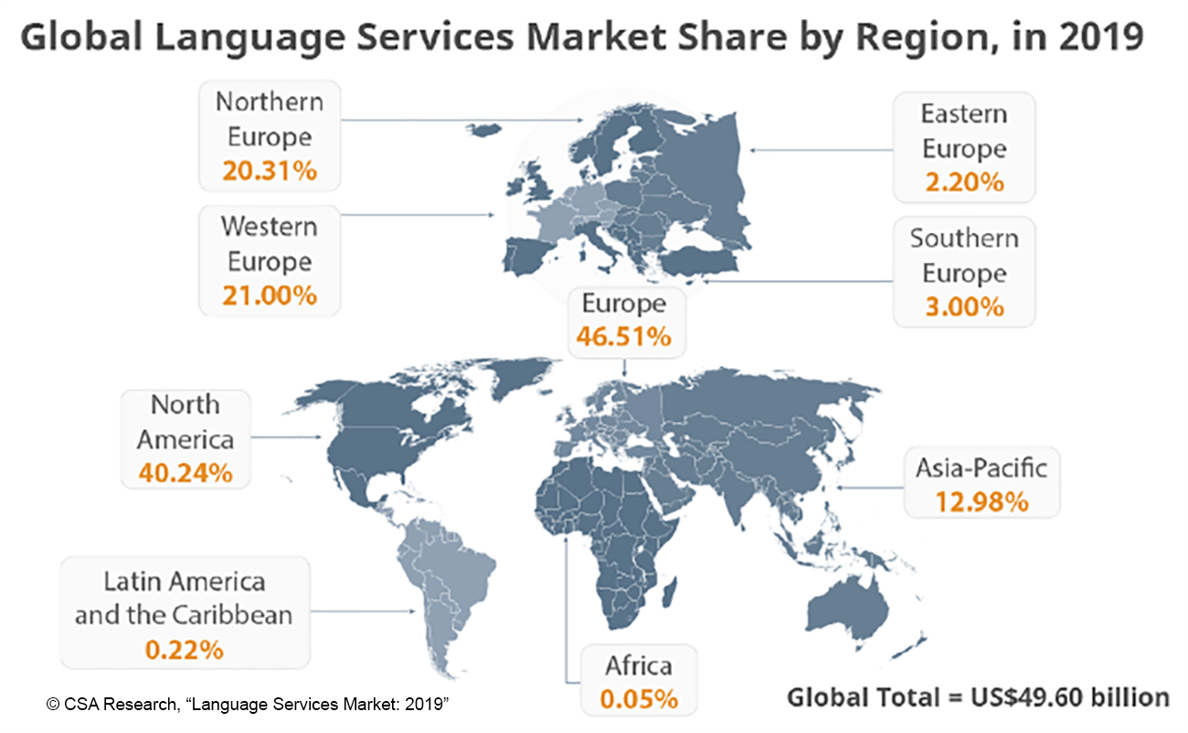 語言服務(wù)遍布世界各地,其中北美的市場份額最大。根據(jù)美國勞工統(tǒng)計(jì)局的統(tǒng)計(jì),僅美國就有3000多家公司,累計(jì)雇傭了55000多人從事語言服務(wù)工作。