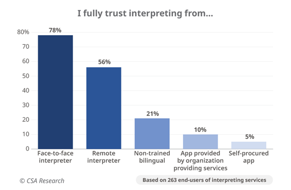 措施各不相同,例如,電話和視頻遠程口譯(分別為 OPI 和 VRI)通常被認為是足夠的解決方案。但研究表明,終端用戶對遠程口譯員的信任度比現(xiàn)場口譯員低 22%。